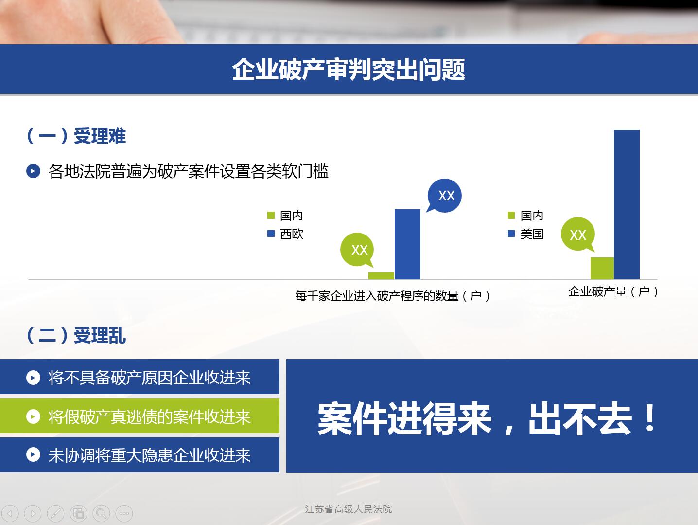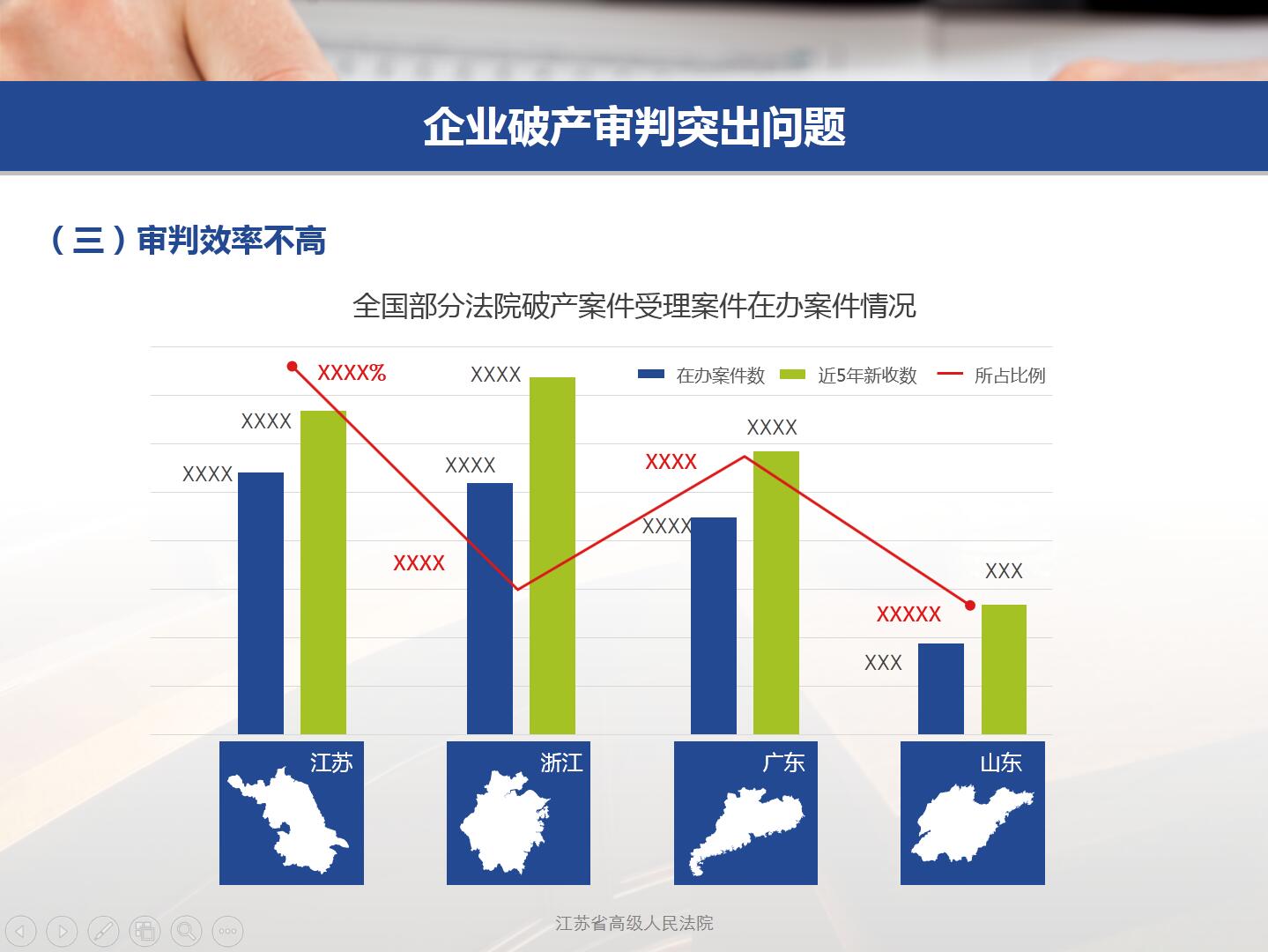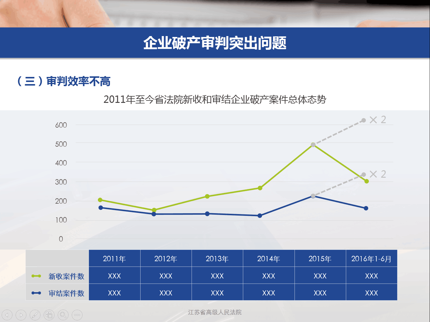 本项目属于项目汇报类。整合全年所有案件数据,总结与分析,用于上报上级,便于管理落实。设计上采用蓝色基调,体现沉着冷静,励志前行;动画上设计简单,配合上级老领导,过于复杂反而破坏画面。